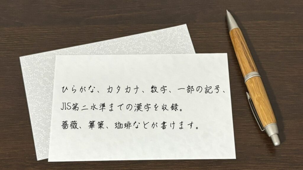 - ひらがな・カタカナ・英数字・記号に加え、漢字は「JIS第二水準」まで収録。